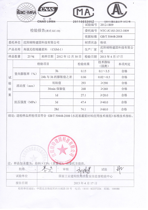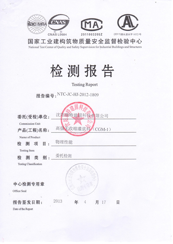 ? ? 灌漿料的執(zhí)行標準在合同和檢測報告上面都有體現(xiàn),下面附兩張我公司的檢測報告的圖片。